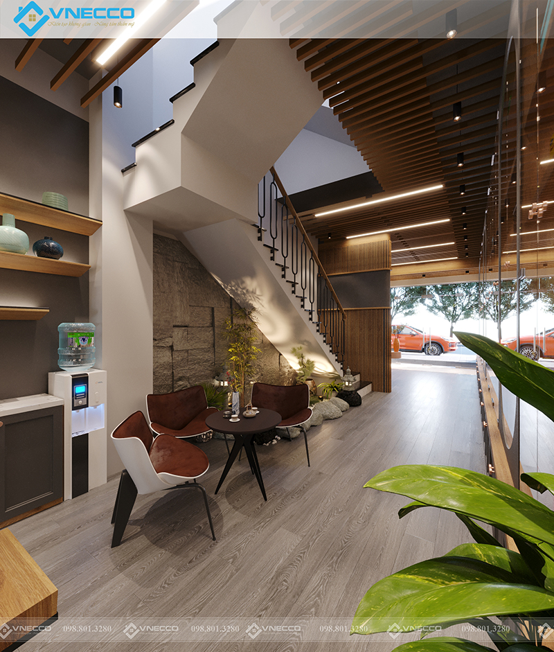 Vật liệu sử dụng thiết kế và thi công là gỗ công nghiệp, gỗ tự nhiên, sắt sơn tĩnh điện và ánh sáng để làm nên điều đó. Ánh sáng trang trí là điểm mạnh không thể thiếu trong thiết kế chung và nội thất nói riêng. Phù hợp với một không gian trưng bầy hoàn chỉnh, các KTS thiết kế của VNECCO đã khéo léo vận dụng các vật liệu đó một cách hài hòa đê tạo nên một không gian sang trọng mà gần gũi với sản phẩm vốn dĩ đầy giá trị này